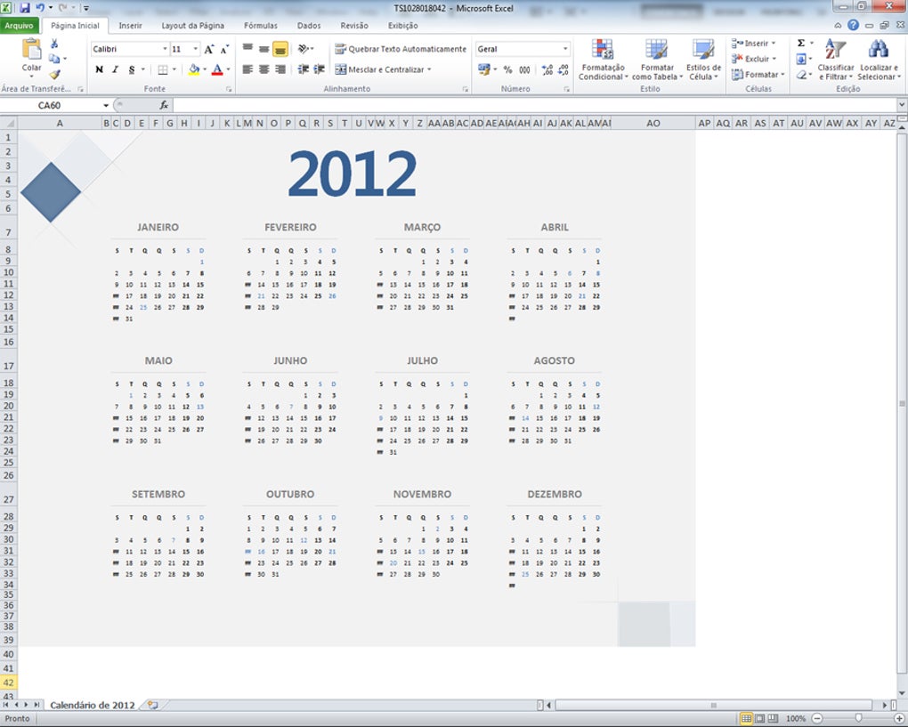 Calendário de 2012 é um calendário pronto para imprimir em formato horizontal e que contém todos os meses do ano em uma única folha. O calendário é compatível com Excel 2010.
